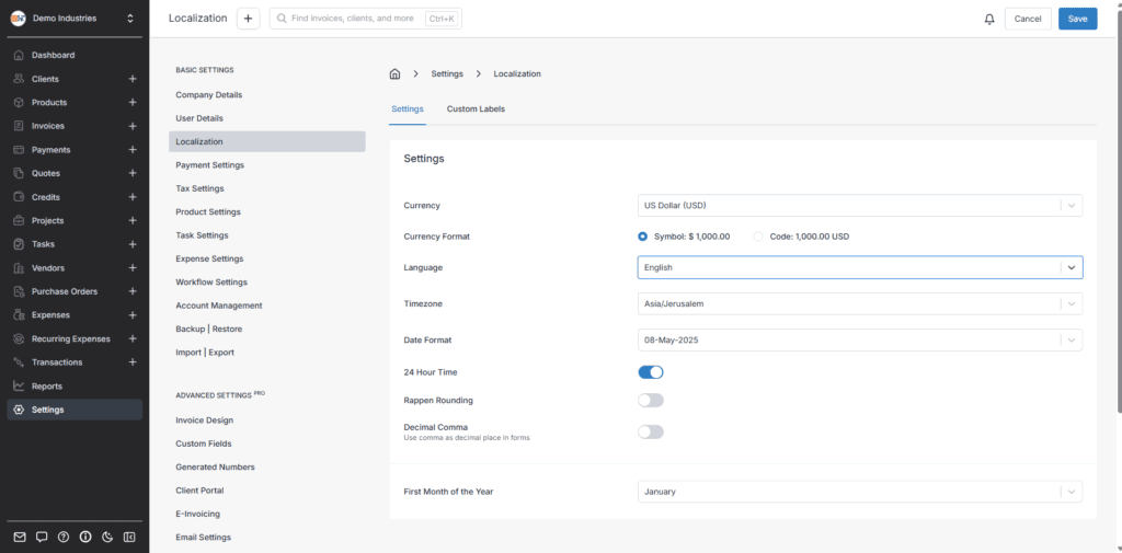 Invoice Ninja supports dozens of languages, currencies, time & date formatting options, and much more.