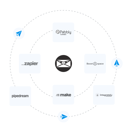 Integrate with hundreds apps via Zapier, n8n, Make, Integrately & more